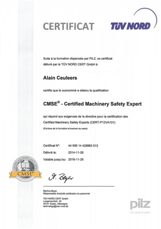 - demande d’intervention d’un de nos ingénieurs certifiés Machinery Safety Expert par le TÜV Nord.